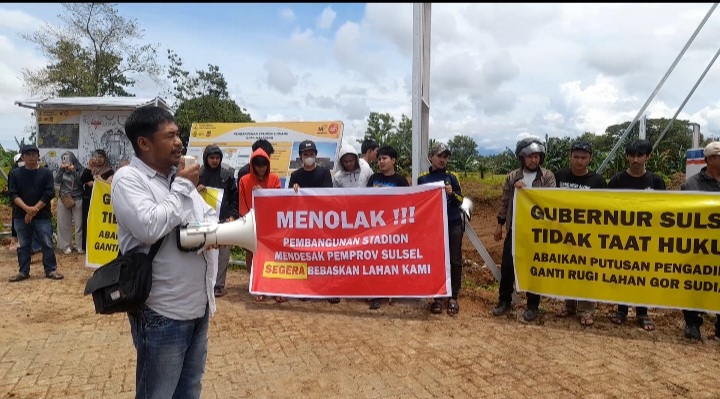 Makassar, Seruan.co.id, — Ahli waris Sobrin Bustam melakukan aksi demonstrasi di Dinas Pemuda dan Olahraga (Dispora) Sulawesi Selatan dan lokasi pembangunan Stadion GOR Sudiang. Mereka menuntut Pemerintah Provinsi (Pemrov) menuntaskan sisa pembayaran ganti rugi lahan seluas 2 hektar atas tanah tersebut.